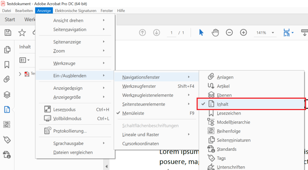 - Im Reiter “Anzeige” > “Ein-/Ausblenden” > “Navigationsfenster” > “Inhalt” aktivieren