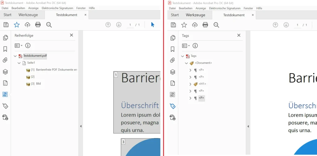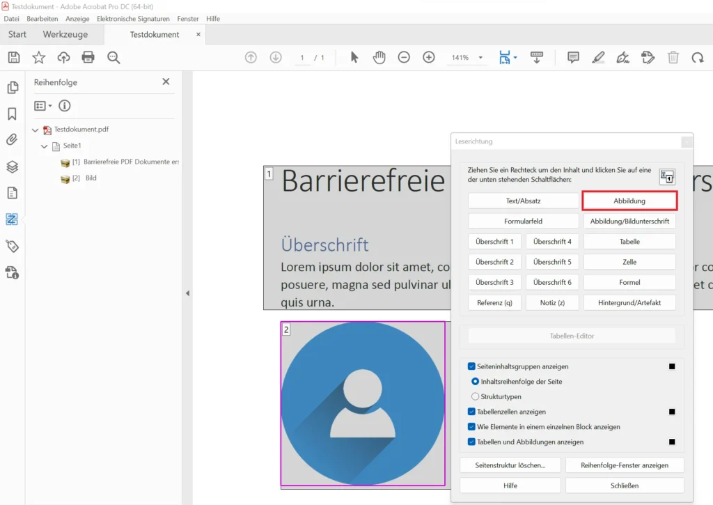 Manchmal tritt im Leserichtung-Fenster der Fehler auf, dass ein Tag nicht korrekt erstellt wird. Im unteren Beispiel wurde ein Bild markiert, welches im Tag-Strukturbaum noch keinen Tag besitzt.