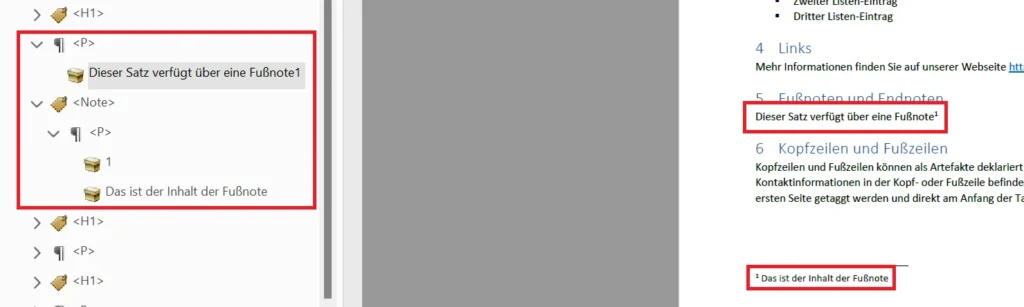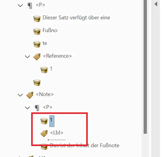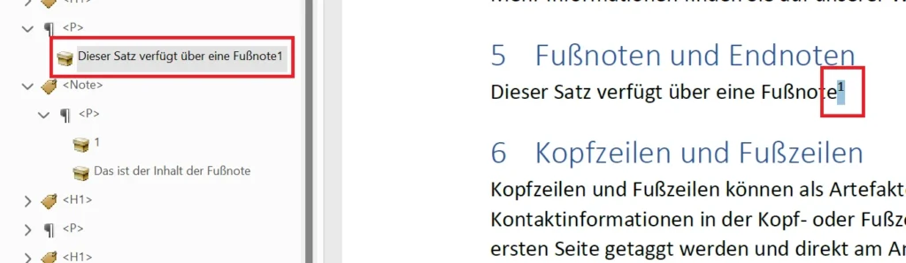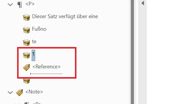 - Im Tag-Strukturbaum Tag mit der Fußnoten-Referenznummer auswählen > Fußzeilen-Referenznummer im Fließtext markieren