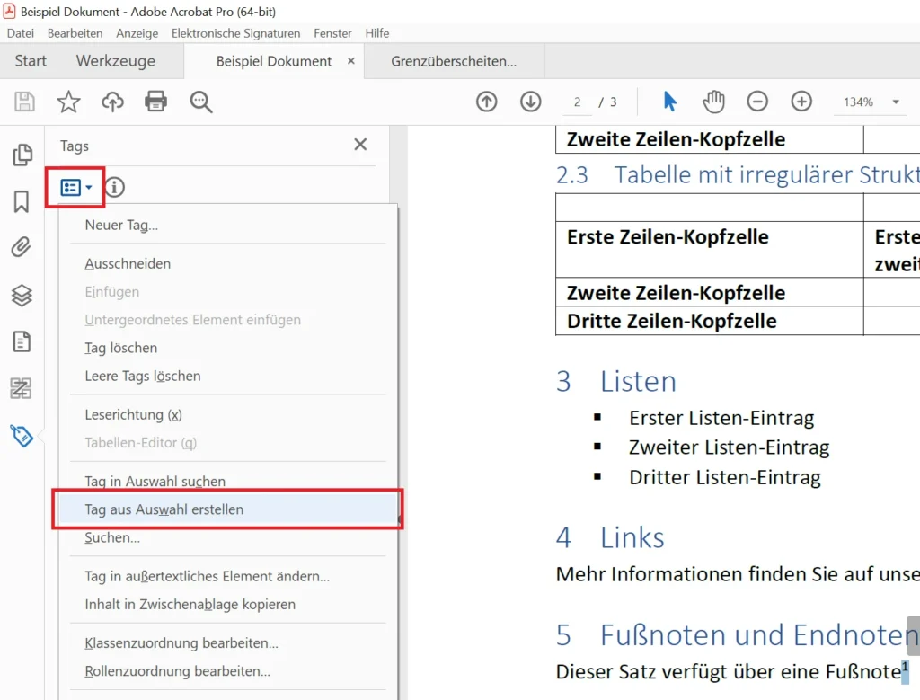 Wenn Sie Ihr PDF aus Word exportieren, werden Fußnoten fast schon korrekt getaggt. Sollte Ihnen ein PDF ohne Tags vorliegen, so müssen Sie die Fußnoten komplett neu taggen. In diesem Beispiel korrigieren wird die Fußnoten-Implementierung von Word.