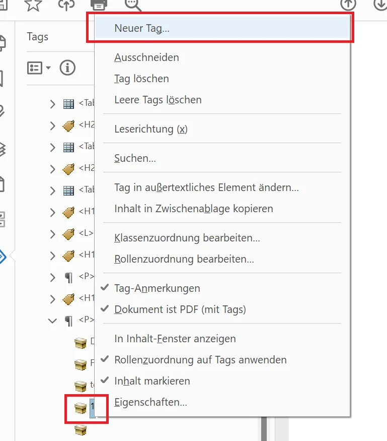 - Im Tag-Strukturbaum Rechtklick auf Fußnoten-Referenznummer (innerhalb des Absatz-Tags) > “Neuer Tag…”