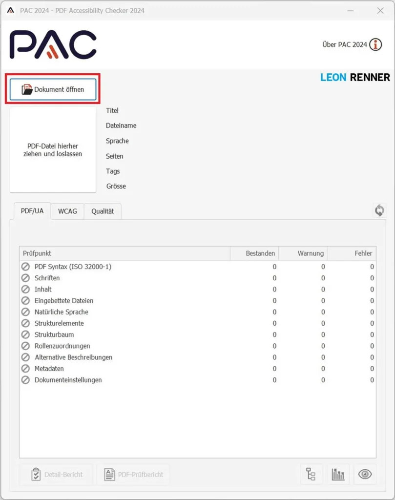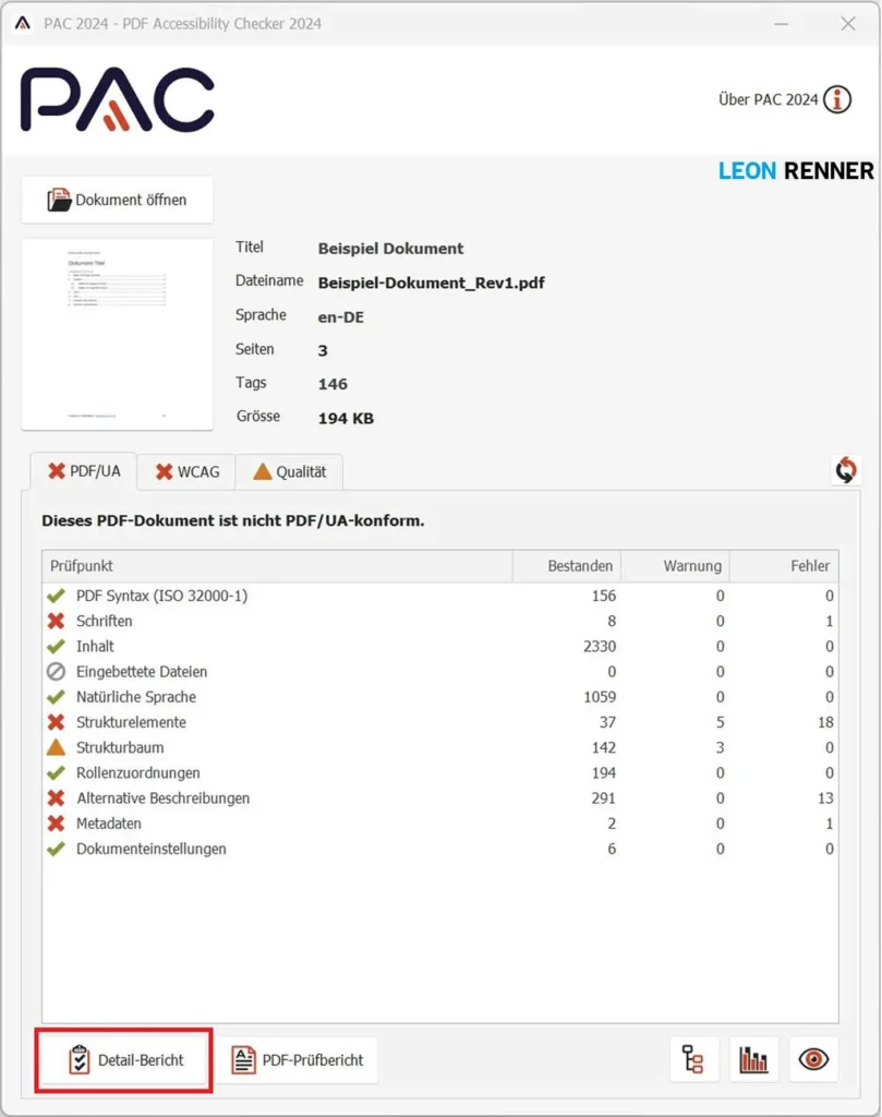 Hinweis: Bevor Sie auf Detail-Bericht klicken, sehen Sie in der Ergebnisübersicht eine Zusammenfassung der Dokument-Evaluierung. Im unteren rechten Bereich der Software können Sie sich die “Screenreader-Vorschau” und die “Logische Struktur” des Dokuments anzeigen lassen. Das sind generell nützliche Funktionen zur Überprüfung der Dokumentstruktur, jedoch geben Ihnen diese Funktionen keine Hinweise darüber, welche Fehler Sie noch ausbessern müssen. Solange der PAC also noch Fehlermeldungen anzeigt, ist der Detail-Bericht die wichtigste Funktion.