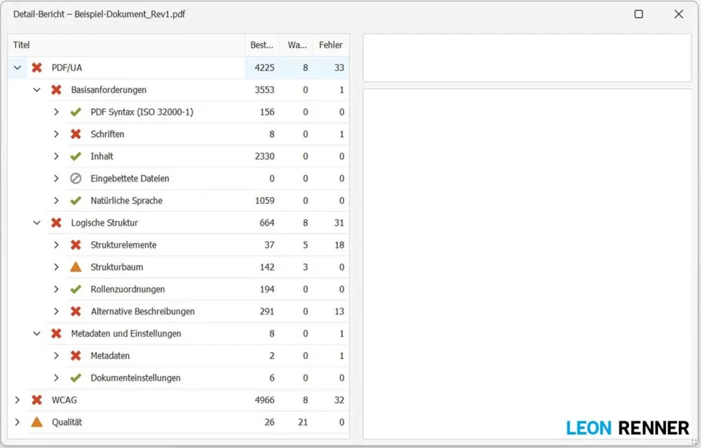 - Die Fehlermeldungen im Strukturbaum des Detail-Berichts erweitern/aufklappen um mehr Details zu erfahren und danach ggf. in Adobe Acrobat beheben