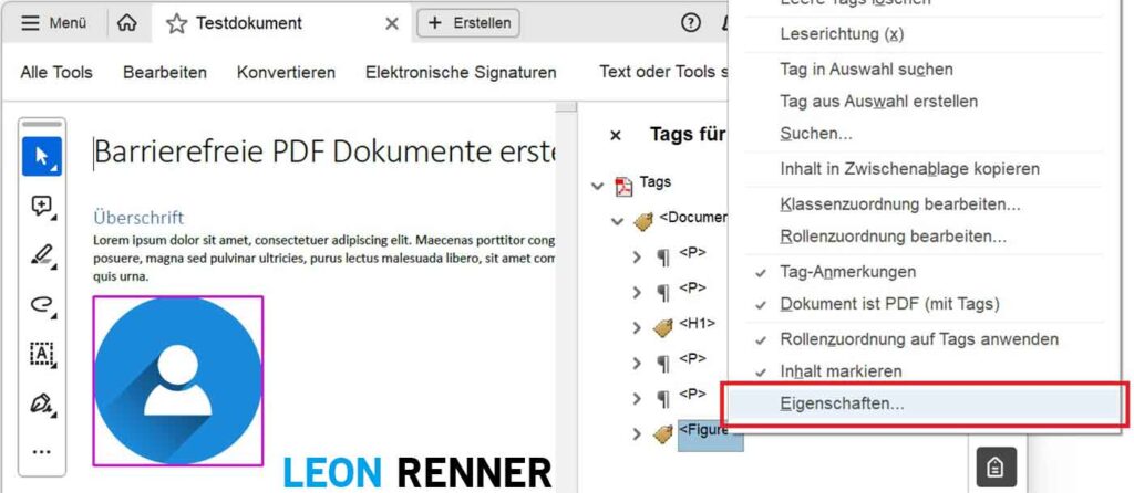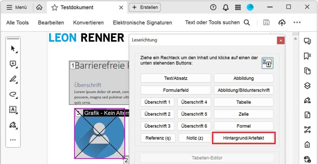 Erstellen Sie Ihr Dokument mit einem gängigen Textverarbeitungsprogramm wie Microsoft Word, da Sie in solchen Programmen für jede Grafik bereits festlegen können, ob sie inhaltlich relevant ist oder nicht. Zusätzlich können Sie inhaltlich relevanten Grafiken auch gleich einen Alternativtext zuweisen. Somit werden die Grafiken während des PDF-Exports korrekt getaggt (oder als Artefakte markiert) und ggf. mit dem Alternativtext versehen. Dadurch müssen Sie den Fehler nicht mehr im Nachhinein im PDF lösen.