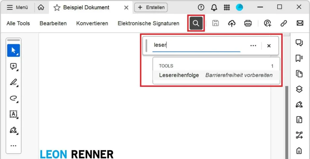 - In der Suchzeile nach dem Tool “Lesereihenfolge” suchen und öffnen