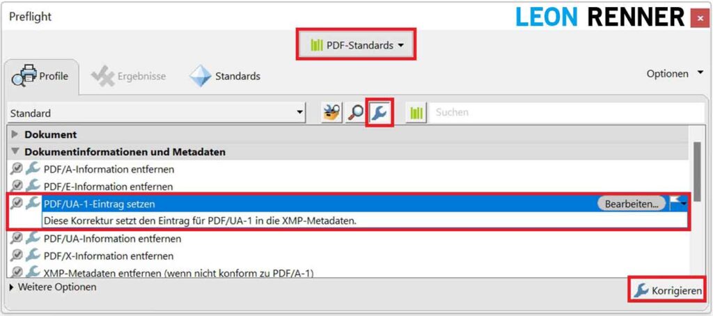 Um den Fehler zu beheben, muss die PDF/UA-Kennzeichnung gesetzt werden.