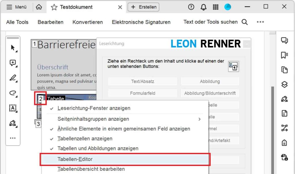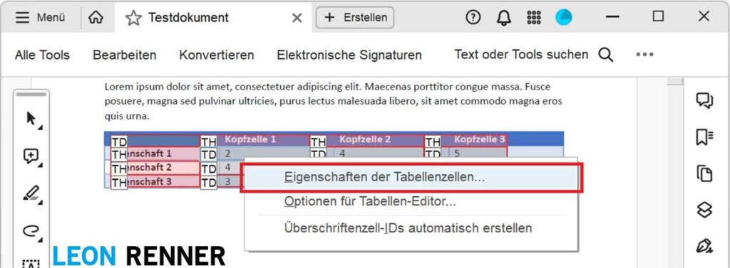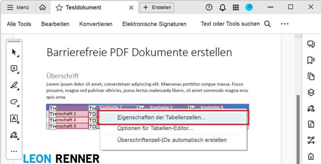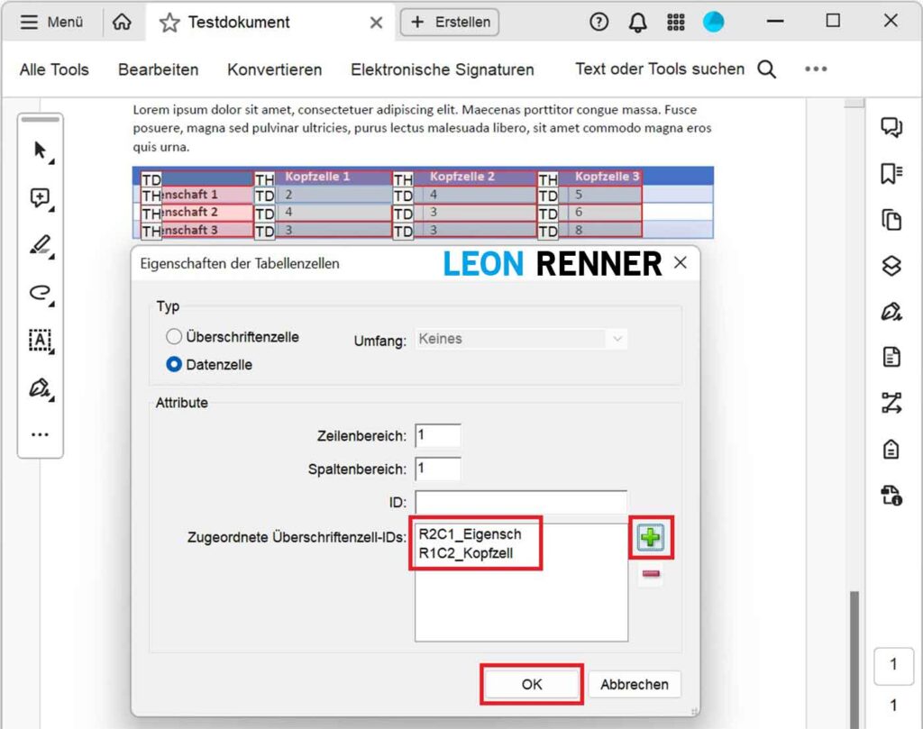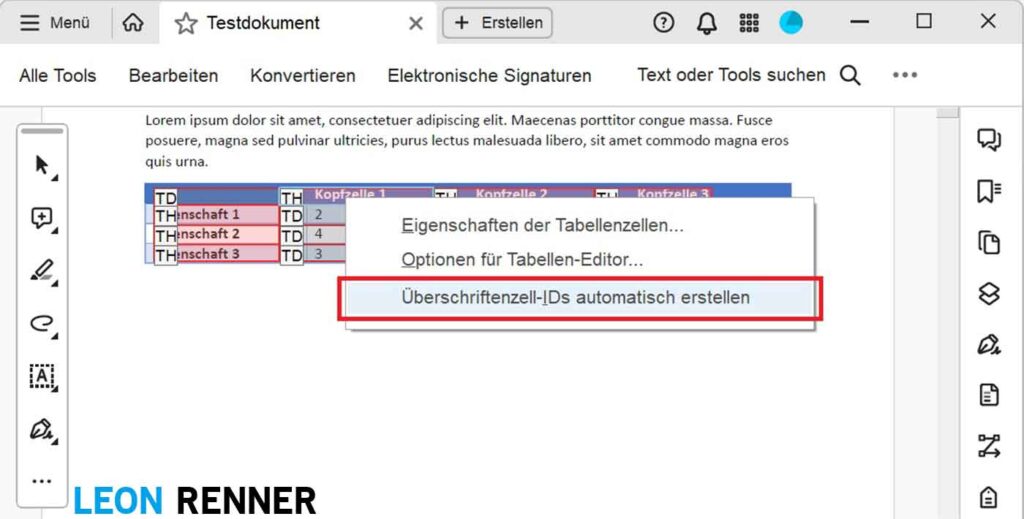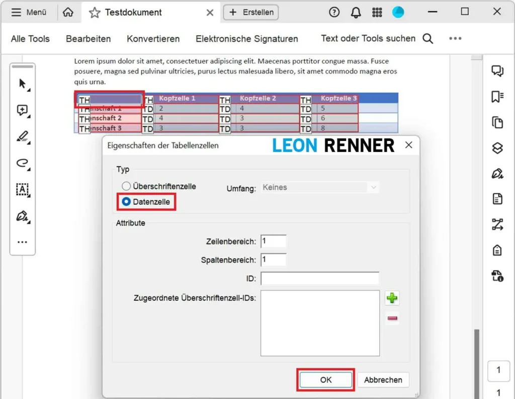 Achten Sie bei der Erstellung von Tabellen auf eine möglichst einfache und konsistente Struktur, damit Sie von der Umfang-Funktion Gebrauch machen können und nicht jede Tabellenzelle einzeln bearbeiten müssen. Falls Sie Ihr Dokument in Microsoft Word erstellen, nutzen Sie zusätzlich die Tabellenformatoptionen (Kopfzeile, Erste Spalte), damit die relevanten Zellen direkt beim PDF-Export aus Word als Tabellenüberschriftenzellen (TH) getaggt werden.