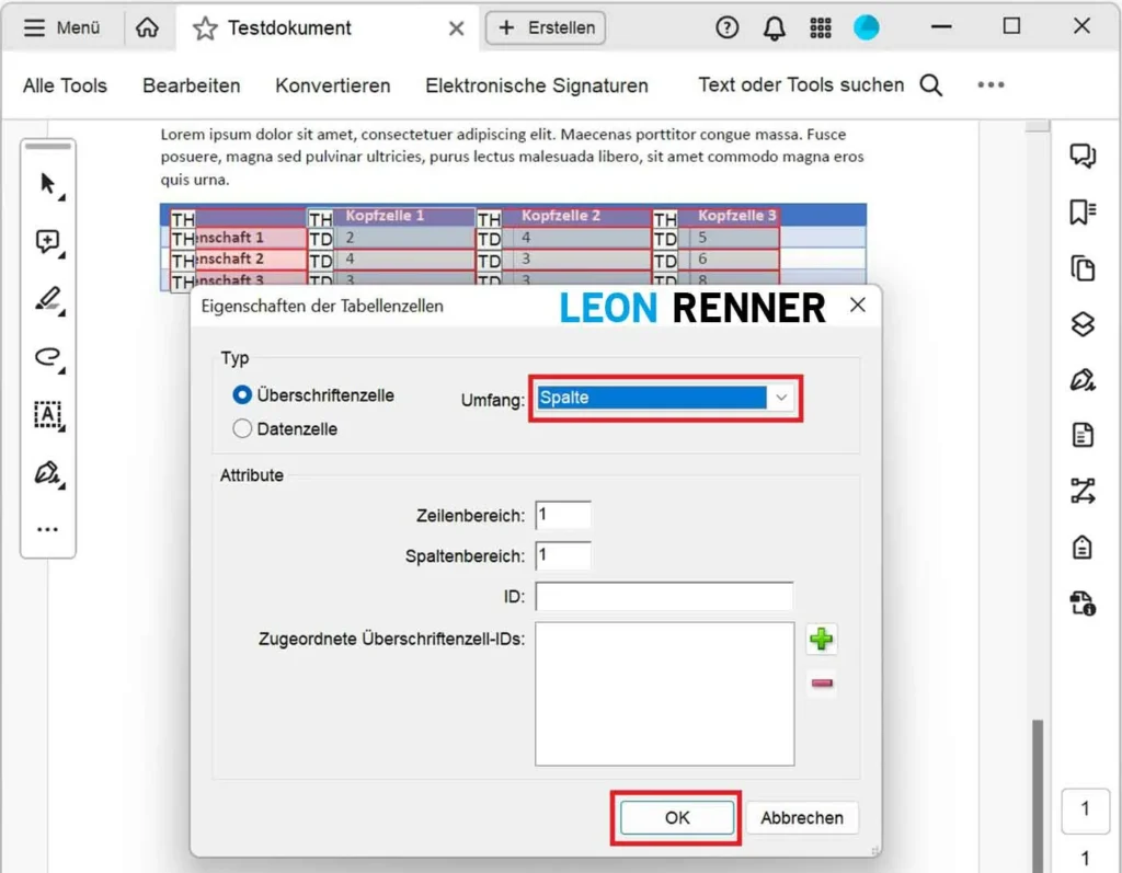 Hinweis: Im aktuellen Beispiel wird eine Tabellenzelle aus der obersten Zeile bearbeitet, welche somit eine Überschriftenzelle für die gesamte Spalte ist. Damit wird der Umfang auf „Spalte“ gesetzt.