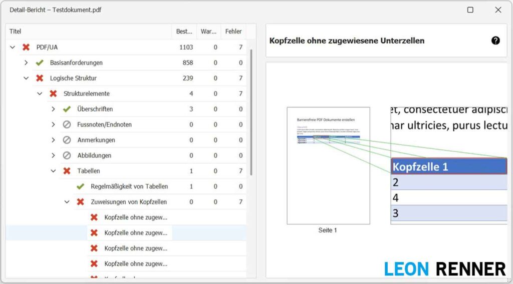 Sobald Sie das Dokument abspeichern und erneut mit dem PDF Accessibility Checker prüfen, ist die Fehlermeldung Kopfzelle ohne zugewiesene Unterzellen verschwunden.