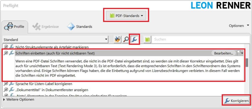 Um den Fehler zu beheben, müssen alle verwendeten Schriftarten in das Dokument eingebettet werden. Die gängigen Schriftarten (z.B. Arial) erlauben eine solche Einbettung. Beachten Sie jedoch, dass manche käuflich erwerbbare Schriftarten teilweise unterschiedliche Lizenzen anbieten und damit eventuell eine spezielle Lizenz für die Einbettung in Print-Medien erworben werden muss.