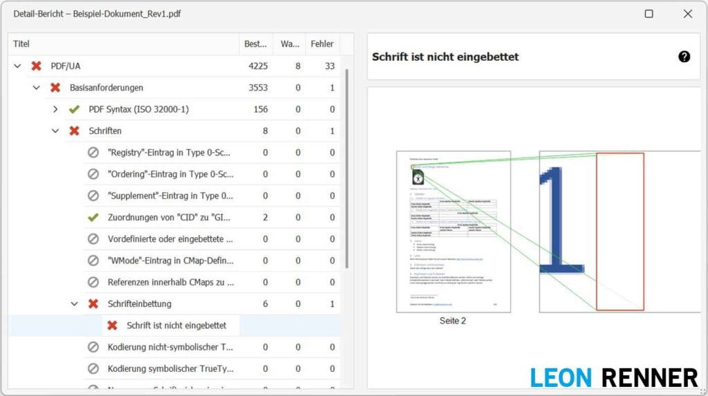 Sobald Sie das Dokument abspeichern und erneut mit dem PDF Accessibility Checker prüfen, ist die Fehlermeldung Schrift ist nicht eingebettet verschwunden.