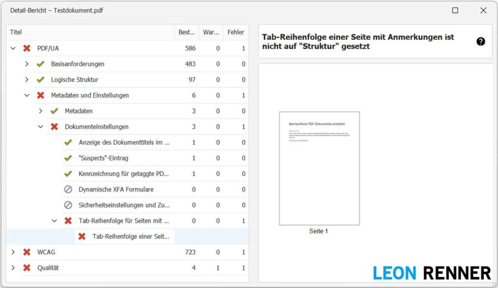 Sobald Sie das Dokument abspeichern und erneut mit dem PDF Accessibility Checker prüfen, ist die Fehlermeldung Tab-Reihenfolge einer Seite mit Anmerkungen ist nicht auf “Struktur” gesetzt verschwunden.